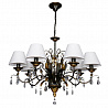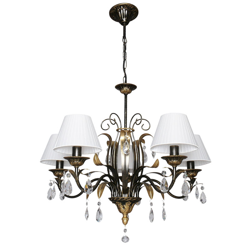 Эту люстру превосходно установить в комнате,выдержанном в стиле классика. Арматура из металла, цвет черный и золотой, подвески прозрачные, плафоны белые из текстиля. Люстра имеет степень защиты IP20.