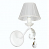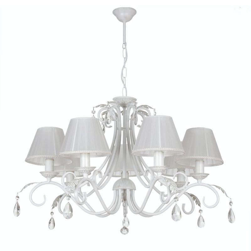 Данную люстру отлично подвесить в интерьере,выполненном в стиле классика и прованс. Каркас из металла, цвет белый, подвески прозрачные, плафоны белые из текстиля. Люстра обладает степенью защиты IP20.