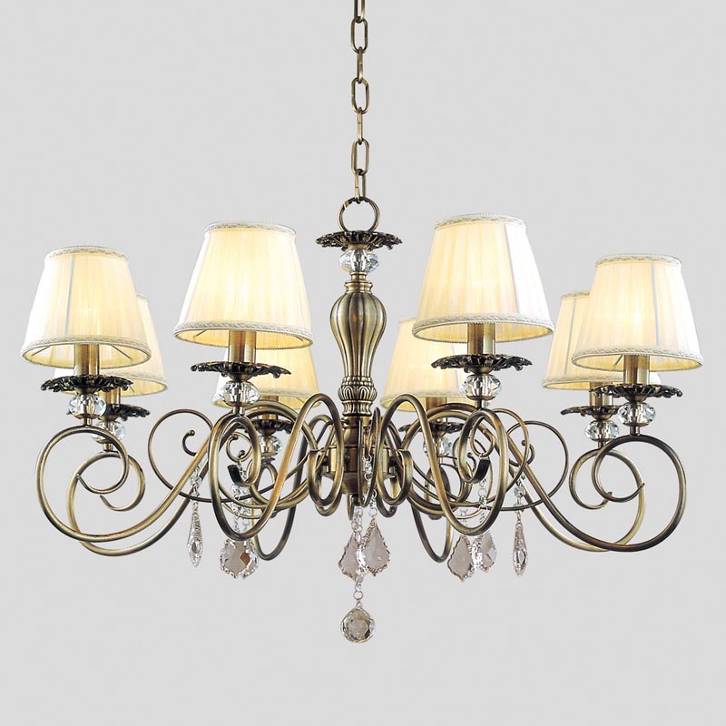 Эту люстру установить в помещении,выполненном в стиле классика. Арматура из металла, цвет бронзовый, подвески прозрачные, плафоны белые из текстиля. Светильник имеет защиту IP20.