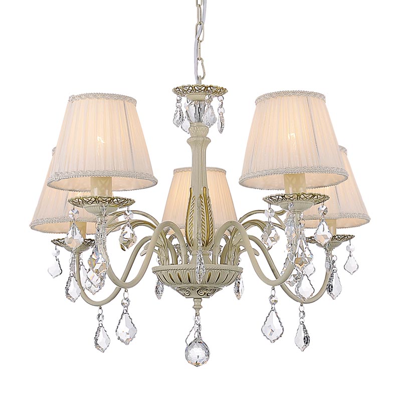 Люстру наилучшим образом установить в помещении,выполненном в стиле классика. Арматура из металла, цвет золотой и белый, подвески прозрачные, плафоны белые из текстиля. Люстра имеет защиту IP20.