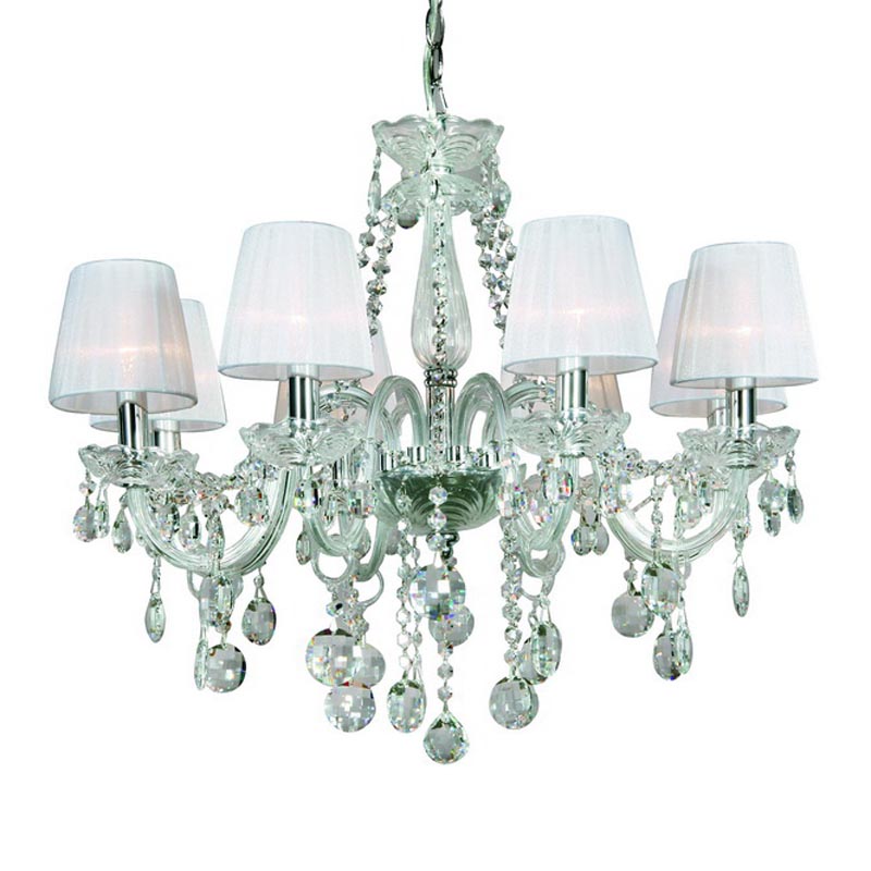 Этот осветительный прибор подвесить в комнате,выполненном в стиле классика. Основание из металла, цвет хромированный, подвески прозрачные, плафоны белые из текстиля. Люстра обладает степенью защиты от воды IP20.