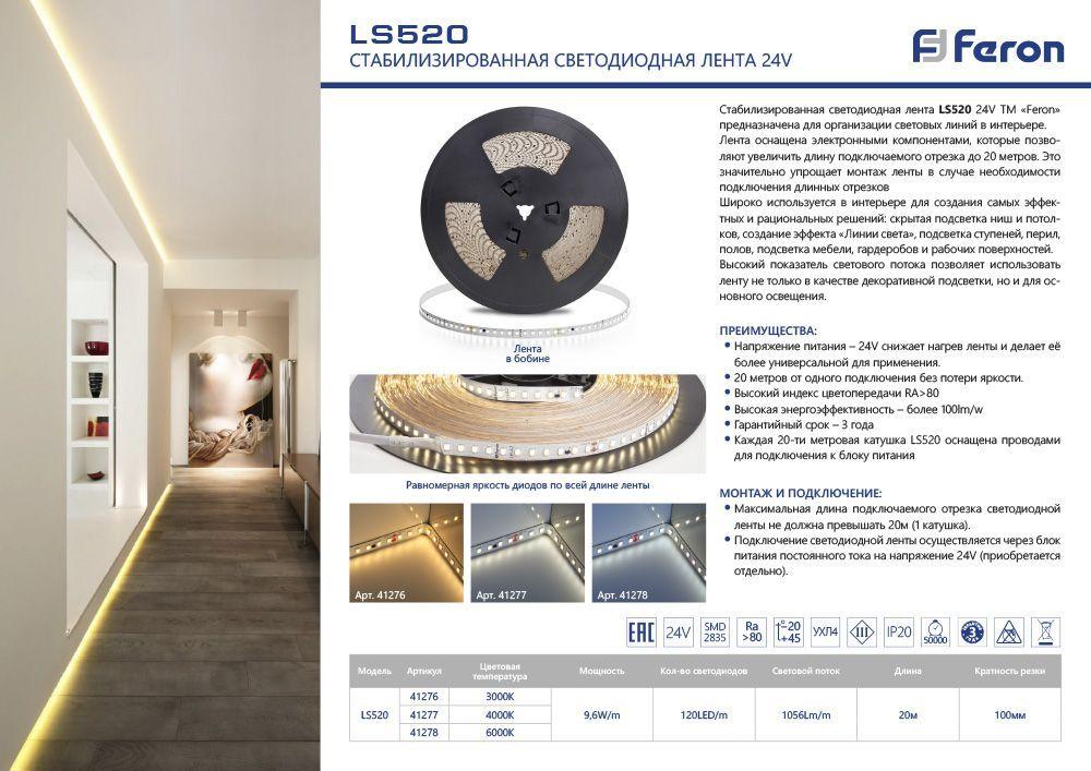 Feron, Россия Светодиодная лента Feron 9,6W/m 120LED/m 2835SMD холодный белый 20M LS520 41278 Есть в наличии 11 125 Руб.