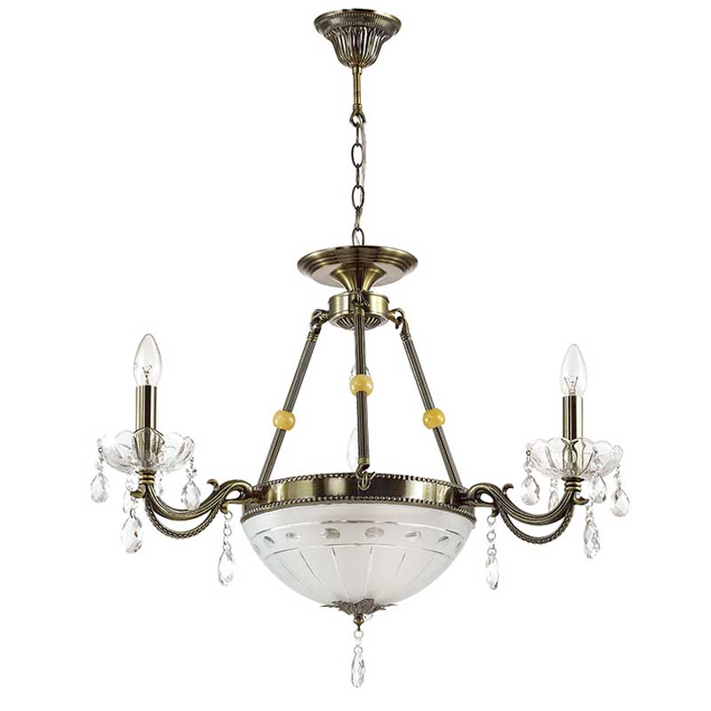Этот осветительный прибор оптимально использовать в комнате,выполненном в стиле классика. Основание из металла, хрусталя и дерева, цвет бронзовый, подвески прозрачные, плафоны белые из стекла. Люстра имеет защиту IP20.