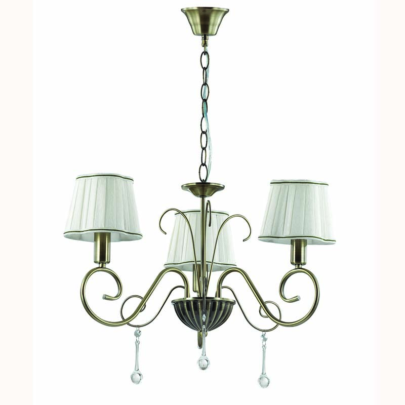 Этот осветительный прибор отлично установить в помещении,выдержанном в стиле классика. Арматура из металла, цвет бронзовый, подвески прозрачные, плафоны белые из текстиля. Люстра имеет степень защиты IP20.
