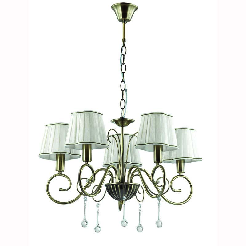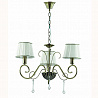 Данную люстру оптимально установить в комнате в стилистике классика. Основание из металла, цвет бронзовый, подвески прозрачные, плафоны белые из текстиля. Светильник имеет степень защиты от воды IP20.
