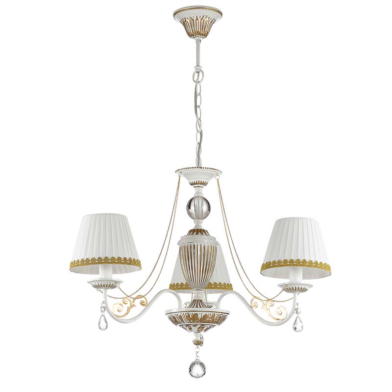 Осветительный прибор отлично подвесить в интерьере, выдержанном в стилистике классика. Основание из металла, цвет белый и золотой, подвески прозрачные, плафоны белые и золотые из текстиля. Светильник имеет степень защиты от воды IP20.