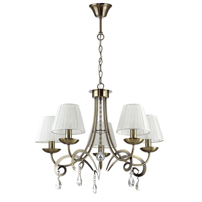 Данный осветительный прибор великолепно установить в комнате,выполненном в стиле модерн. Арматура из металла, цвет бронзовый, подвески прозрачные, плафоны белые из текстиля. Люстра имеет степень защиты IP20.