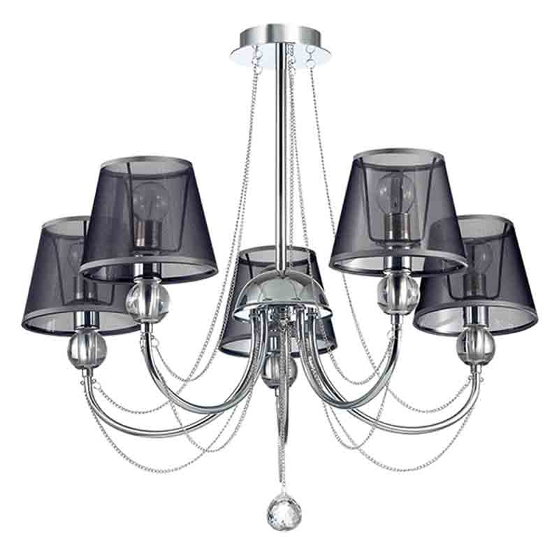 Данную люстру подвесить в помещении,выполненном в стилистике модерн. Основание из металла и стекла, цвет хромированный, подвески прозрачные, плафоны серые из текстиля. Люстра обладает степенью защиты IP20.