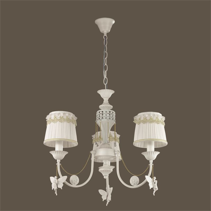 Этот осветительный прибор наилучшим образом использовать в помещении в стиле классика. Арматура из металла, цвет белый и золотой, подвески белые и золотые, плафоны белые из текстиля. Люстра имеет защиту IP20.