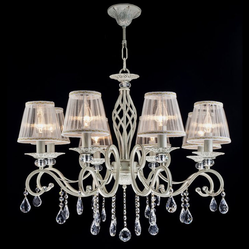 Данную люстру хорошо подвесить в комнате,выполненном в стиле прованс и классика. Арматура из металла, цвет белый, подвески прозрачные, плафоны белые из текстиля. Светильник обладает степенью защиты от воды IP20.