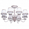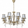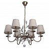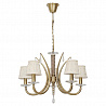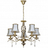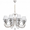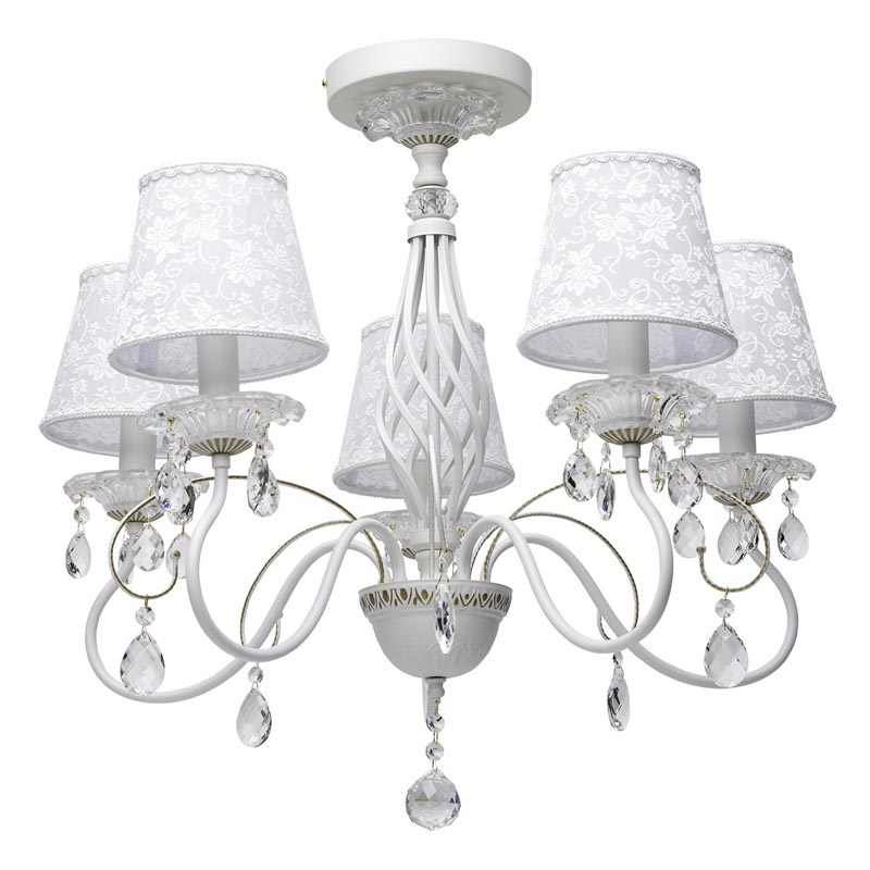 Этот осветительный прибор отлично установить в интерьере в стилистике классика и прованс. Арматура из металла, цвет белый и золотой, подвески прозрачные, плафоны белые из текстиля. Светильник имеет защиту от воды IP20.