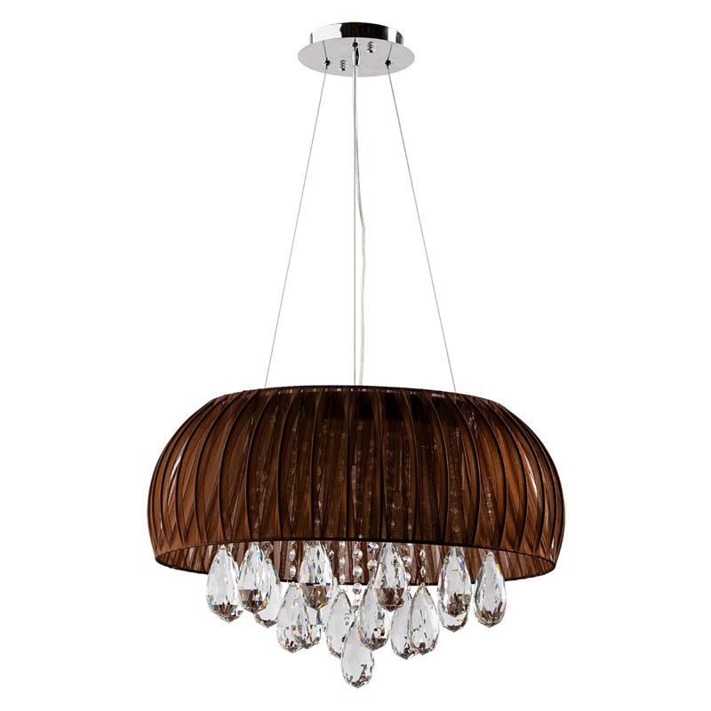 Люстру наилучшим образом подвесить в комнате в стилистике модерн. Каркас из металла, цвет хромированный, подвески прозрачные, плафоны коричневые из текстиля. Светильник имеет степень защиты от воды IP20.