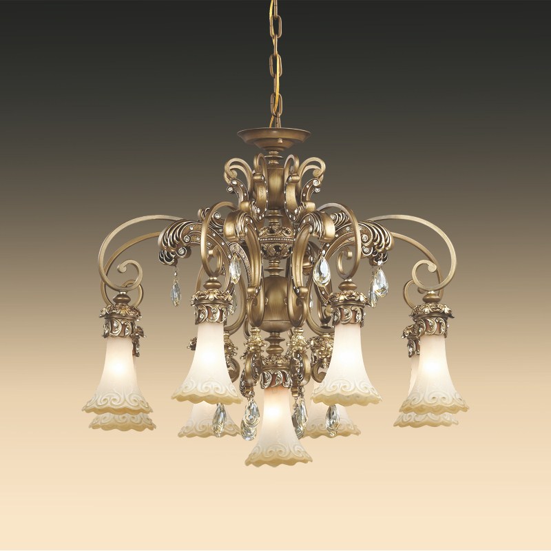 Осветительный прибор наилучшим образом использовать в интерьере, выдержанном в стилистике классика. Основание из металла, цвет бронзовый, подвески прозрачные, плафоны бежевые из стекла. Люстра обладает степенью защиты от воды IP20.