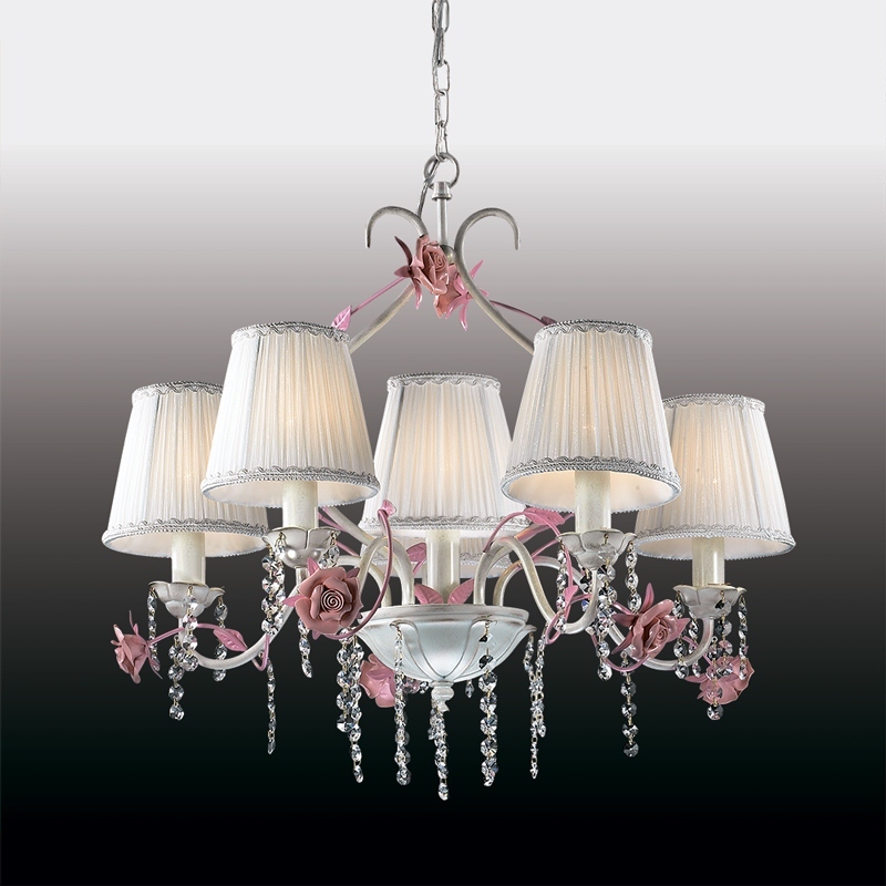 Люстру хорошо установить в помещении,выполненном в стилистике классика и флористика. Каркас из металла, цвет белый и розовый, подвески прозрачные, плафоны белые из текстиля. Люстра имеет защиту от воды IP20.